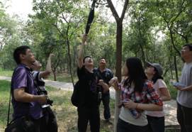 下午继续向北宫森林公园进发。山头不高,山脚下有几匹马驹,一方水池,炎炎烈日下,添了几分清爽。沿着小路上行,道旁有很多酸枣树和桑葚树,恰到桑葚成熟的季节,密密的叶子下缀着饱满的果子,缀不住掉在地上,一片紫、一片白,引来一地麻雀,很是热闹。同行师生很快都加入了摘桑葚的行列,一开始还是小心翼翼地尝试,到后来索性放开了采,场面欢乐,仿佛回到了童年。在北宫森林公园的迷你动物园,大家纷纷被浣熊、孔雀、小熊猫、大耳朵羊等动物吸引了,尤其是活泼的小猴子,令人忍俊不禁,流连忘返。