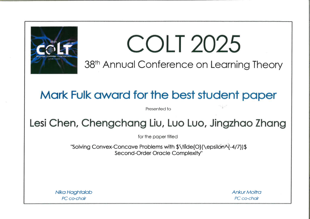 博士生陈乐偲和张景昭助理教授的科研成果“Solving Convex-Concave Problems with O(ϵ−4/7) Second-Order Oracle Complexity”在机器学习理论的国际顶级会议Conference on Learning Theory (COLT) 2025上荣获最佳学生论文奖。